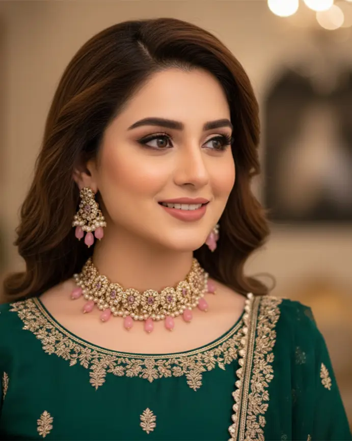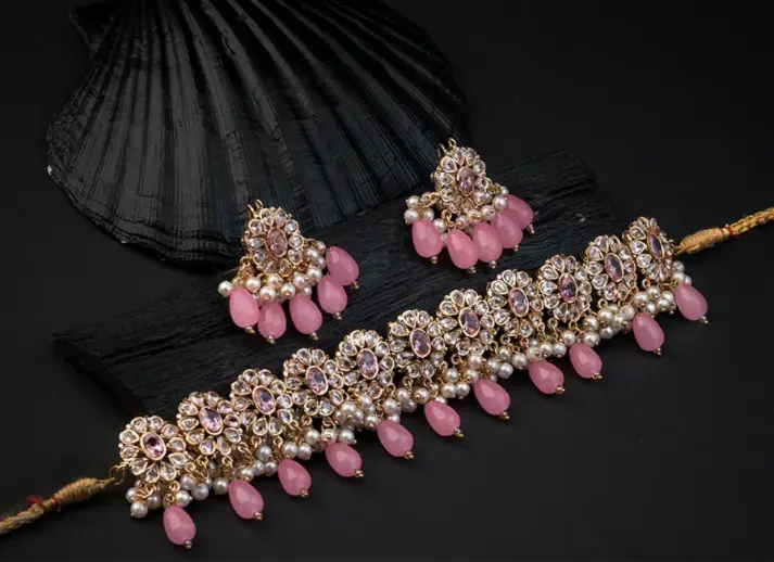 This exquisite jewelry set features a beautifully crafted choker adorned with lustrous pearls and delicate pink stones, paired with matching earrings. The intricate design combines traditional elegance with a modern touch, making it perfect for weddings, festive occasions, or formal events. Its rich detailing and soft hues add a graceful charm to any outfit.